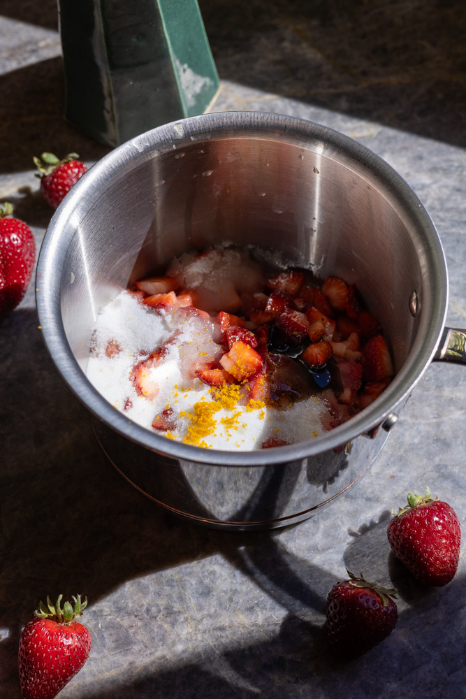 - Combine strawberries, sugar, lemon juice + zest, salt, and vanilla paste in a pot. Toss to coat; macerate 30 minutes.